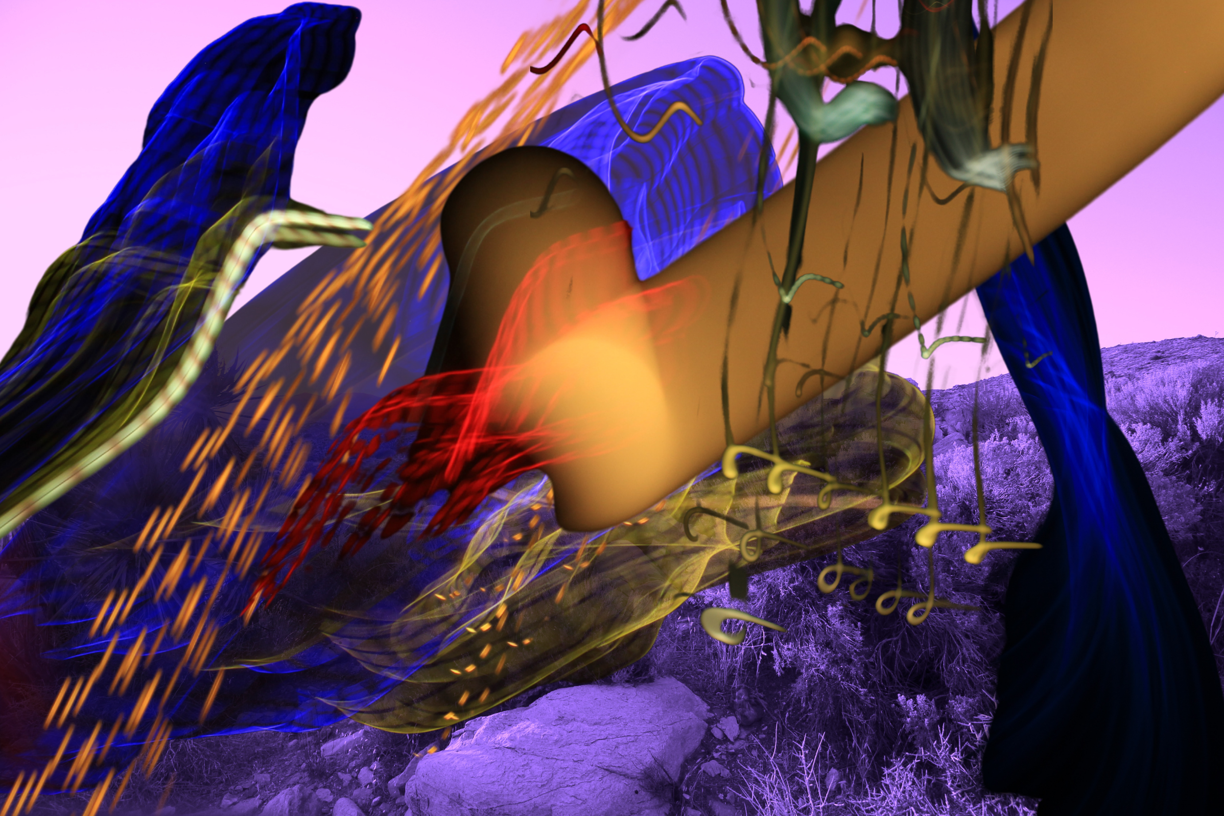 Imagination Marks are superimposed with thousands of the artist’s own rural landscape photographs captured throughout California and Colorado. These photographs are combined with urban light burst photographs of Los Angeles and Denver created by using the artist’s loose and energetic hand gestures. York then digitally colors, cuts and intersects these images directing the viewer’s gaze, establishing a sense of balance and wonder. York’s Imagination Marks exude a deep, colorful and dynamic presence, revealing a playful and exciting energy that is both atmospheric and profound.