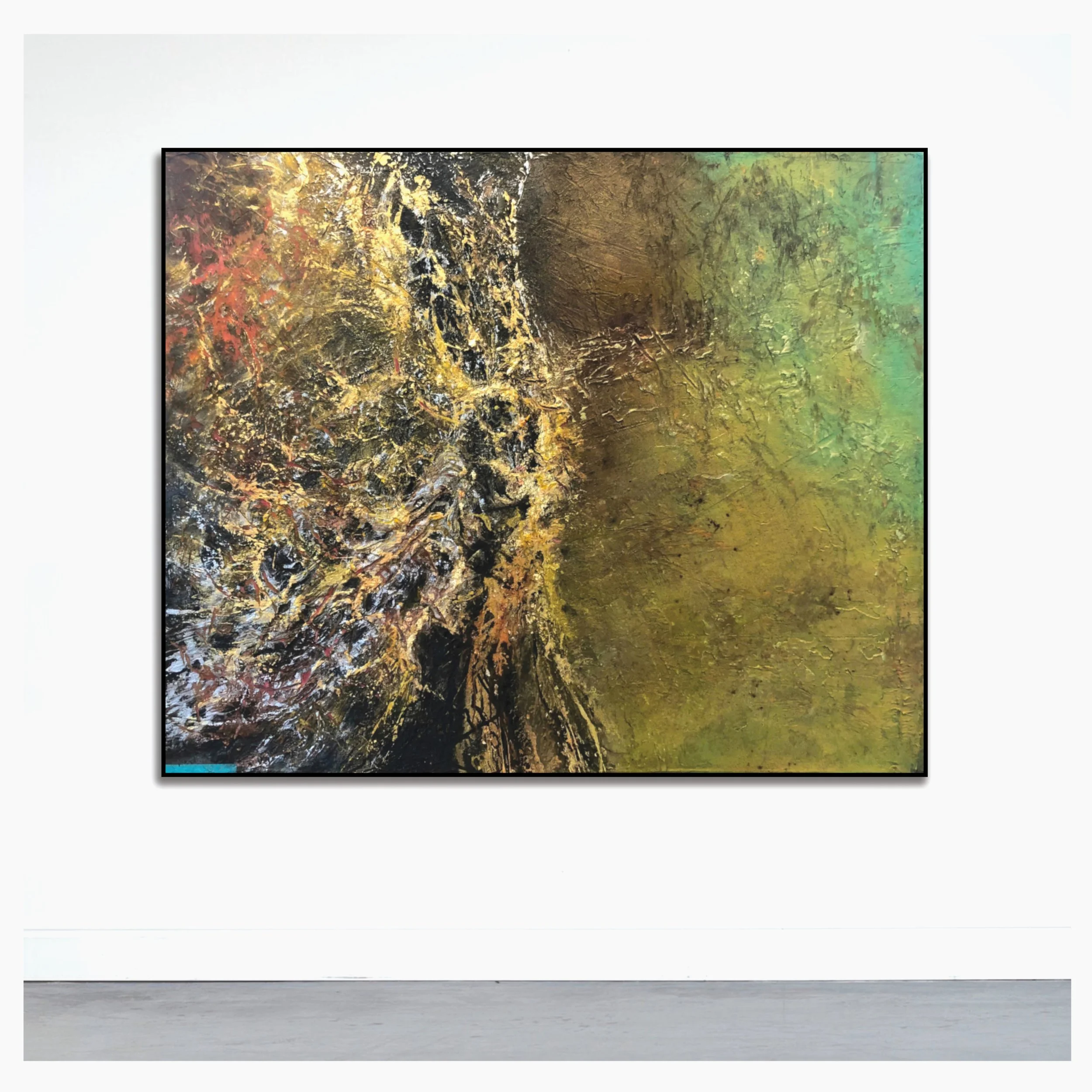 Materials used: Oil, acrylic, gold and metallic paint on stretched canvas in artist’s hand made frame